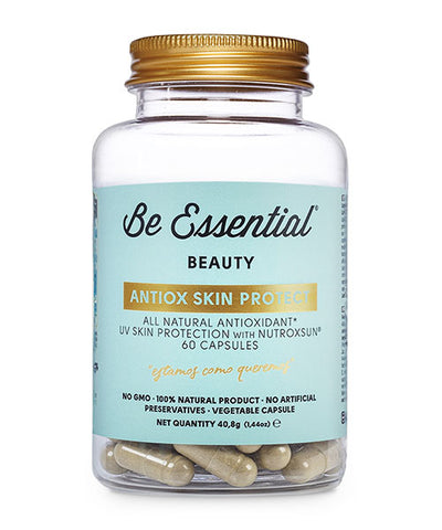 ANTIOX SKIN PROTECT de Be Essential® contiene extractos naturales de helecho de Costa Rica -Polypodium leucotomos- y saponaria japónica -Polygonum cuspidatum-, ambos con evidencia científica de su elevada capacidad de proteger la piel desde el interior gracias a su poder antioxidante y foto-inmuno protector contra los rayos UVA y UVB. Además, su fórmula contiene NutroxSun®, un activo protector y reparador de la piel con extracto de pomelo y romero que ayudan a prevenir la aparición de manchas solares. Por último, hemos añadido a su fórmula un extra de vitaminas B3, C, E y NAC (N-Acetil L-Cisteína) que complementan sus beneficios sobre piel y mucosas con su potente efecto antioxidante, protegiendo las células del efecto dañino de los radicales libres.